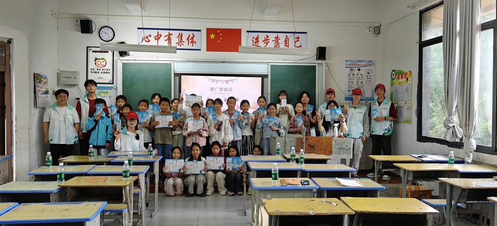 在安顺市紫云自治县第六小学,志愿服务实践队充分发挥近年“推普助力乡村振兴”实践经验,通过发放推普宣传册、知识讲解与开展趣味语言挑战等相结合的丰富形式为孩子们送上了一堂生动的“普通话课”。