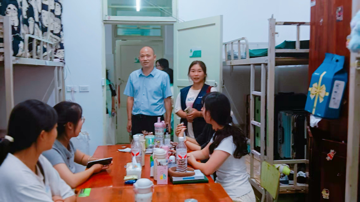 为深入了解2025级新生入学情况,帮助新生尽快适应大学生活,9月2日晚,学院党委书记胡蕾、副院长李云根、党委副书记杨明分组带领辅导员和各新生班主任深入新生宿舍,开展寝室走访和安全排查活动。