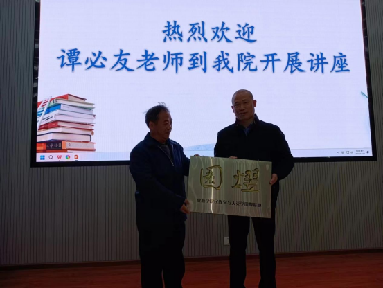 人文学院聘请谭必友教授为我院兼职教授,李云根副院长为其颁发了聘书。同时,谭必友教授授予我院“熤园——安顺学院民族学与人类学田野基地”牌匾,共享熤园实践基地。李云根副院长指出,我院师生要多与湖南师范大学民族学人类学中心师生进行交流学习,今后也将继续邀请更多专家学者为我院师生举行学术讲座,营造浓厚的学术科研氛围,加强学科专业建设。