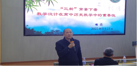 最后,程垚老师做了题为《“三新”背景下看教学设计在高中历史教学中的重要性》的讲座,她围绕课标要求、教材分析、学情分析、教学目标、教学重难点、教学方法、教学过程、教学评价和教学反思等九个方面讲解了“三新”背景下如何“教”,以抛砖引玉的方式讲述如何更好地为教育事业做贡献,从而实现“立德树人”的根本任务。