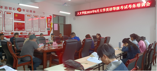 为贯彻落实好教育部考试中心、贵州省招生考试院及学校相关要求,确保2024年6月15日全国大学英语等级考试顺利进行,2024年6月13日下午,人文学院组织本院参加此次监考的教师在人文学院会议室进行考务培训。