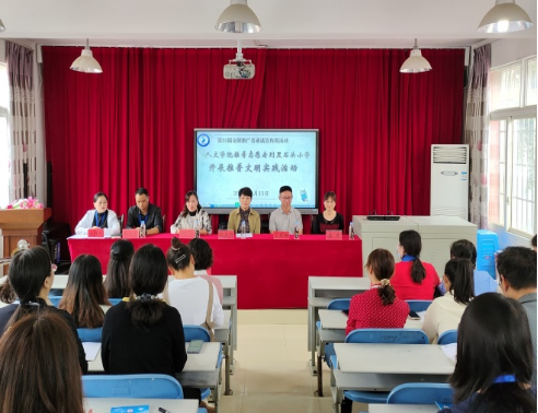 活动开始,黑石头小学向飞校长致辞,对人文学院师生的到来表示了热烈的欢迎。随后,胡赤兵教授就“推普助力乡村振兴”进行了交流发言。胡院长解读了推普助力乡村振兴的重要意义,并对如何做好推普助力乡村振兴工作提出了建议,她认为首先要有强有力的组织领导;其次切记“一阵风”,必须长期坚持;此外必须创新推普助力乡村振兴的形式,针对不同的群体精准施策。胡院长强调,老师应该担当起推普主力军的重任,为推普助力乡村振兴贡献自己的一份力量。接着,人文学院蓝芳副教授就计算机辅助普通话水平测试相关内容、丁友锏老师就普通话发音技巧相关内容对黑石头小学的老师进行了培训。培训过程中,老师们认真学习、积极互动,现场氛围十分活跃。最后,人文学院的杨艳娟、伍若男、刘藏励、范博远、张旭等五位同学为大家表演了朗诵节目《永远铭记》,活动就此落下圆满的帷幕。