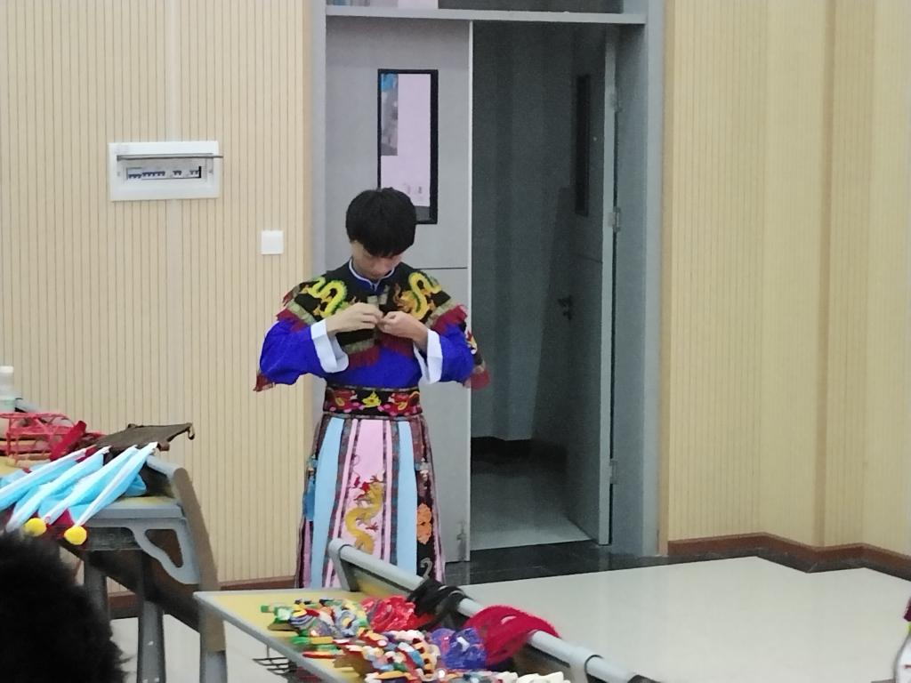 齐老师对地戏的起源、发展脉络、传统规制、文化内涵等问题进行了生动的讲述,让大家对这项古老艺术的历史底蕴有了更深刻的认识。更令人欣喜的是,齐老师还现场展示了地戏的服装道具,手把手指导同学们进行穿戴,并亲身示范地戏演唱的独特腔调,耐心教大家练习简单的地戏动作,并细致解读每一个动作、每一段唱腔背后的文化意蕴。