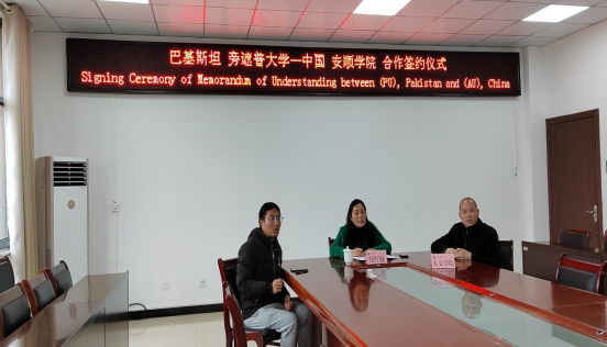 2023年12月21日下午3点,安顺学院与巴基斯坦国立旁遮普大学以线上视频方式,在安道楼513会议室正式签订两校合作备忘录。我校副校长殷红敏教授、人文学院副院长李云根教授与田雪枫博士出席了本次签约仪式。