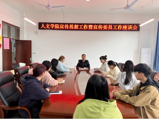 为进一步加强我院宣传思想工作,提升宣传委员工作能力,2024年4月9日下午,人文学院在会议室召开宣传思想工作暨宣传委员工作座谈会。人文学院党委副书记杨明及各班宣传委员参加会议,会议由学院团总支负责人张瑞欣主持。