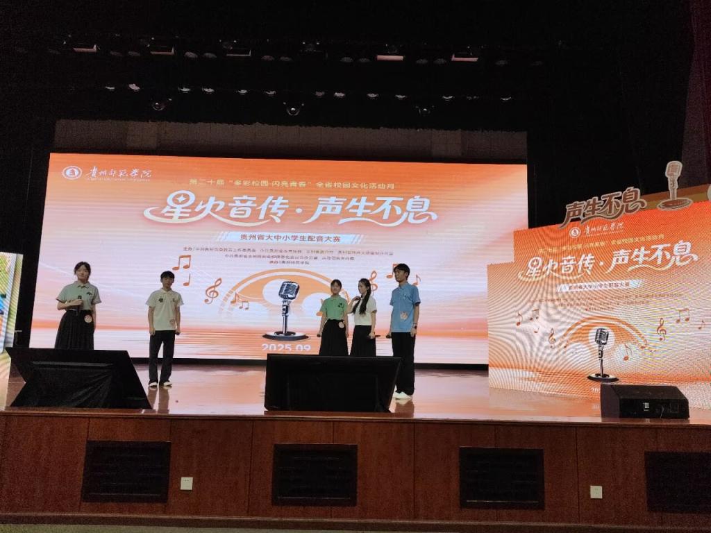 2025年9月12日,2025年贵州省第二十届“多彩校园 闪亮青春”全省校园文化活动月之全省大中小学生“星火音传·声生不息”配音大赛省赛在贵州师范学院逸夫楼演播厅落下帷幕。我院刘锋、曹云凤、夏梦梅、汤鑫、时庆迎、黎梦洁6位学生与艺术学院、外语学院部分学生共同参与的参赛队伍,凭借《香山叶正红》《白蛇2:青蛇劫起》《烈火英雄》《疯狂动物城》四部高质量配音作品,最终斩获省赛三等奖。