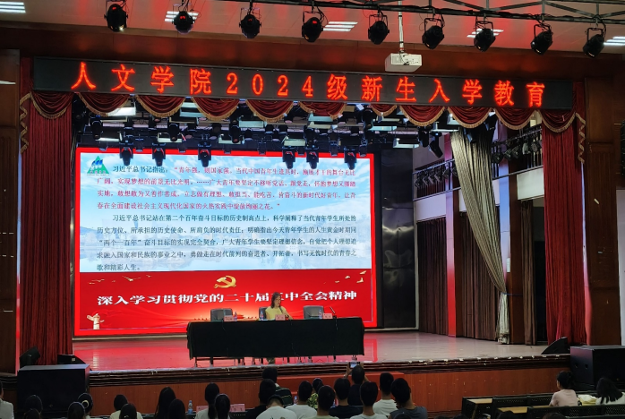 2024年9月5日下午,为加强我院2024级新生的入学教育,引导新生不断提高思想认识水平,坚定理想信念,助力新生“扣好人生的第一粒扣子”,人文学院党委书记胡蕾于学校大礼堂为2024级新生上思想政治理论课。活动由学院党委副书记杨明主持。