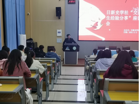 人文学院日新史学社于2023年11月2日晚在安道楼102阶梯教室举行了“交换生经验分享”座谈会。人文学院历史学教研室主任燕国华老师、广州大学交换生明予池同学、贵州大学交换生梁咏棋同学以及日新史学社全体成员参加活动。