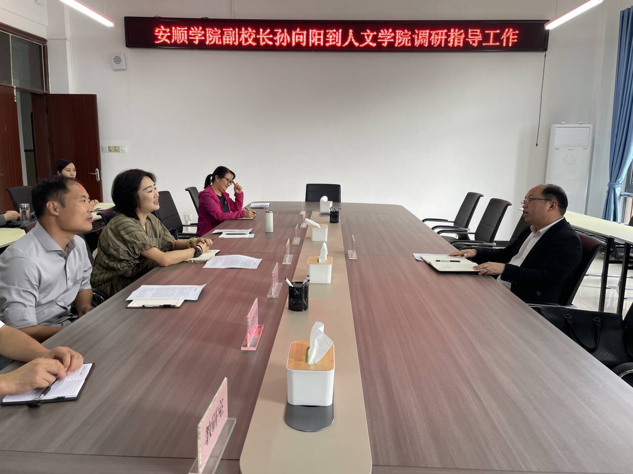 2025年10月13日下午,安顺学院副校长孙向阳到人文学院调研指导工作。人文学院领导班子全体成员、科级干部及部分教师代表参加此次调研座谈。会议由学院党委书记胡蕾主持。