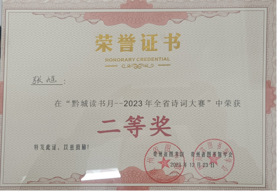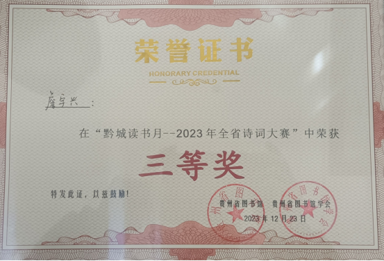 2023年12月23日,人文学院学生张旭、詹宇兴两位同学在贵州省图书馆参加贵州省图书馆、贵州省图书馆协会举办的“黔城读书月2023年全省诗词大赛”,经过激烈角逐,张旭、詹宇兴分别斩获二等、三等奖。
