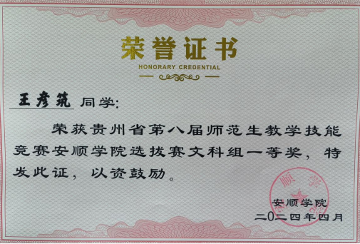 经过紧张而又激烈的比赛,我院王彦筑同学荣获贵州省第八届师范生教学技能竞赛安顺学院选拔赛文科组一等奖,周陈燕、熊爽同学荣获贵州省第八届师范生教学技能竞赛安顺学院选拔赛文科组二等奖。最终,王彦筑、周陈燕两位同学将分别参加贵州省第八届师范生教学技能竞赛语文组、历史组的比赛。