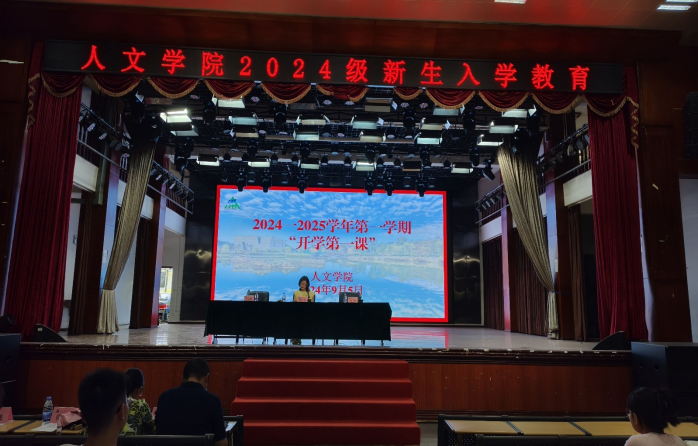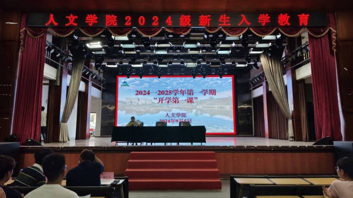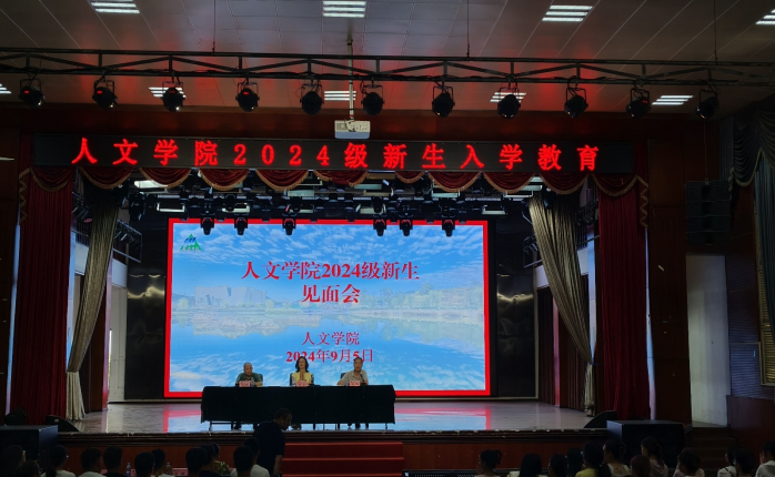 2024年9月5日下午,为引导新生尽快适应大学新环境、转变新角色,进一步明确学习目标、合理规划大学生活,我院于学校大礼堂举办2024级新生见面会暨入学教育活动。人文学院党委书记胡蕾、副院长李云根、学生科科长杨正宏、团总支书记伍国桃、新生班班主任及2024级各专业新生参加活动。活动由学院党委副书记杨明主持。